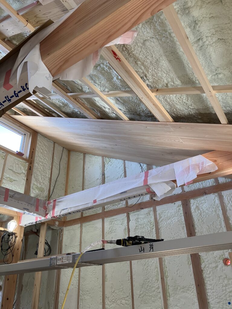 ひとつひとつの木の状態をみながら、丁寧に施工しています。梁が通っているので、腕の見せ所です…!