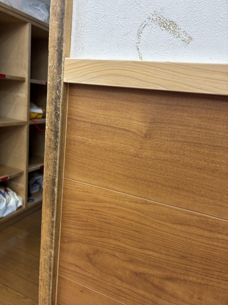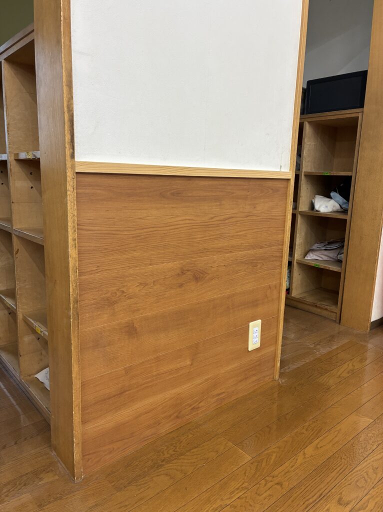 ↑なるべく床のフロアーに似た色を合わせてみました。床から約1Mの高さまで板張りにすることで、今までの素材と比べて格段に強く安心して使っていただけるようになったと思います。