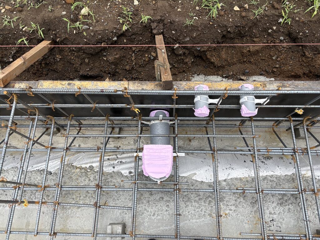 こちらは基礎配筋と排水部分(ピンクテープの部分)の様子です。