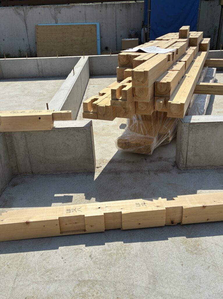 この日は土台敷きでした。とても暑い1日でしたが棟梁による作業は順調に進みます。