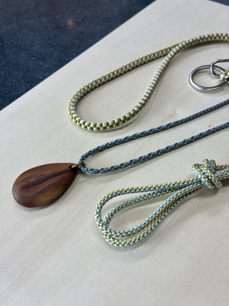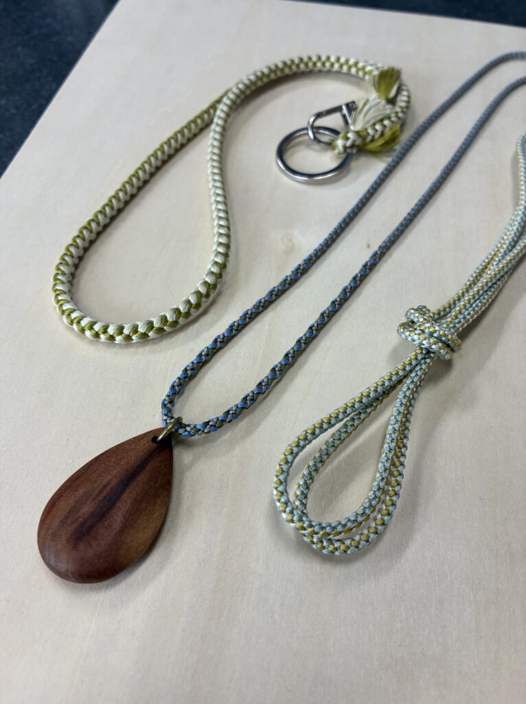細めの紐で組むネックレスは女性におすすめ。ペンダントヘッドはお手持ちの品でももちろん良いですし、木で作ったヘッドをお使いいただくことも可能です。