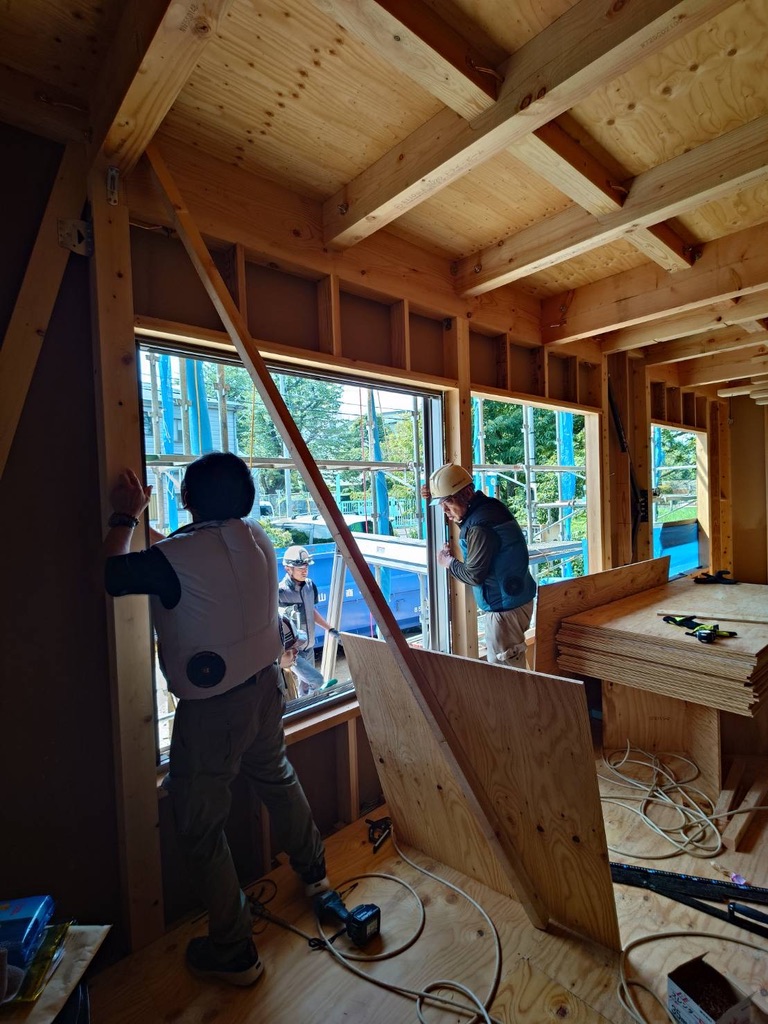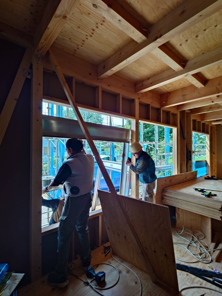 大工さんは基本的に1人で作業をしていますが、大きな物の搬入や取り付け時には一緒に作業を進めてくれます。このようにチームワークをとりながら家づくりは進みます。ひとつひとつを丁寧に進めてくれる大工さんはじめ職方さんには心から感謝です。