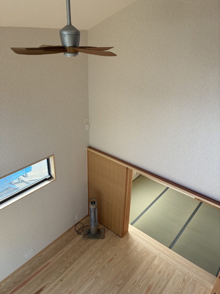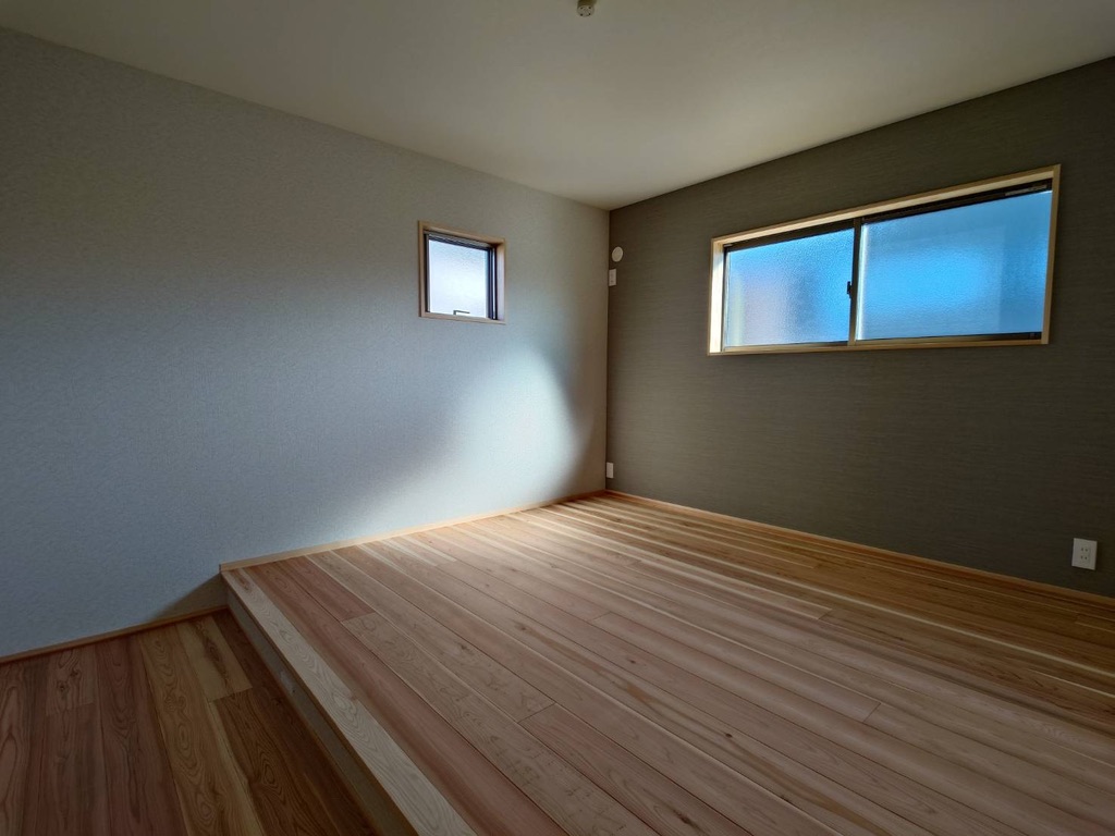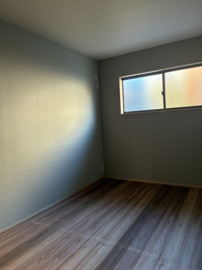 2階は主に3部屋から出来ています。こちらは「寝室」。ポイントはご覧の通り床を少し上げている事です。ベッド風の使い方が出来ることもありますが、段差をつけることで埃だまりを避けることもできる効率の良い空間です。奥のアクセントクロスとの相性もとてもかっこいい仕上がりでした。