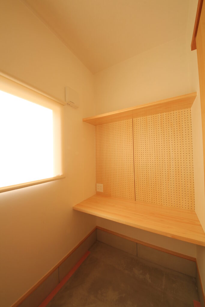 コンパクトなお部屋です。ご主人の趣味部屋としてご用意させていただきました。床が土間仕上げなので、多少の汚れも気にならず、カウンター正面はフックで飾れるパネルに仕上げさせていただきました。