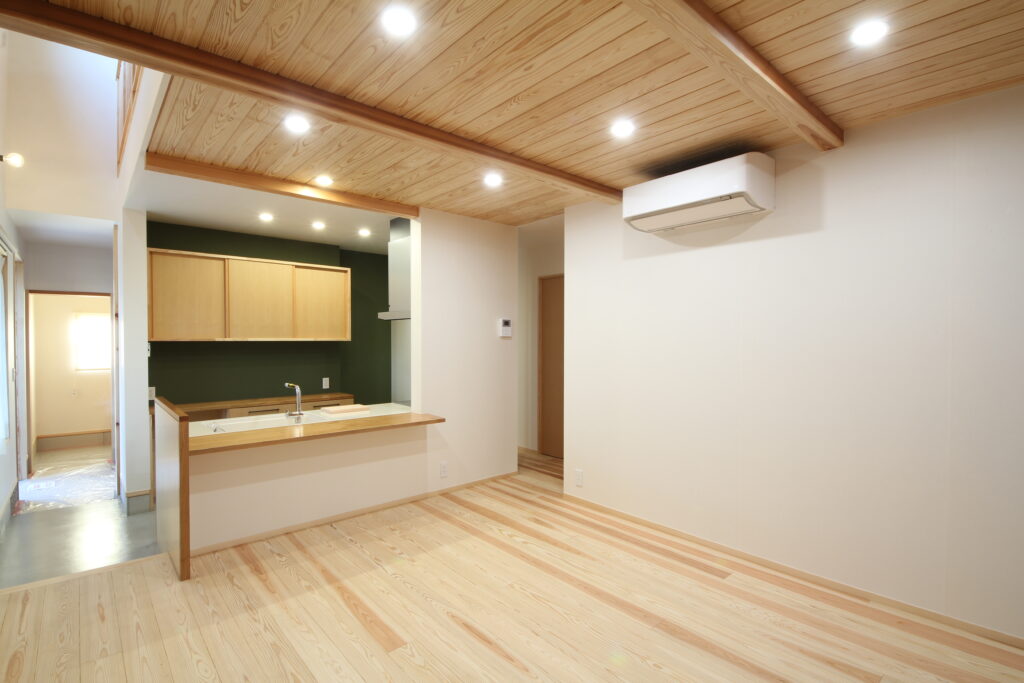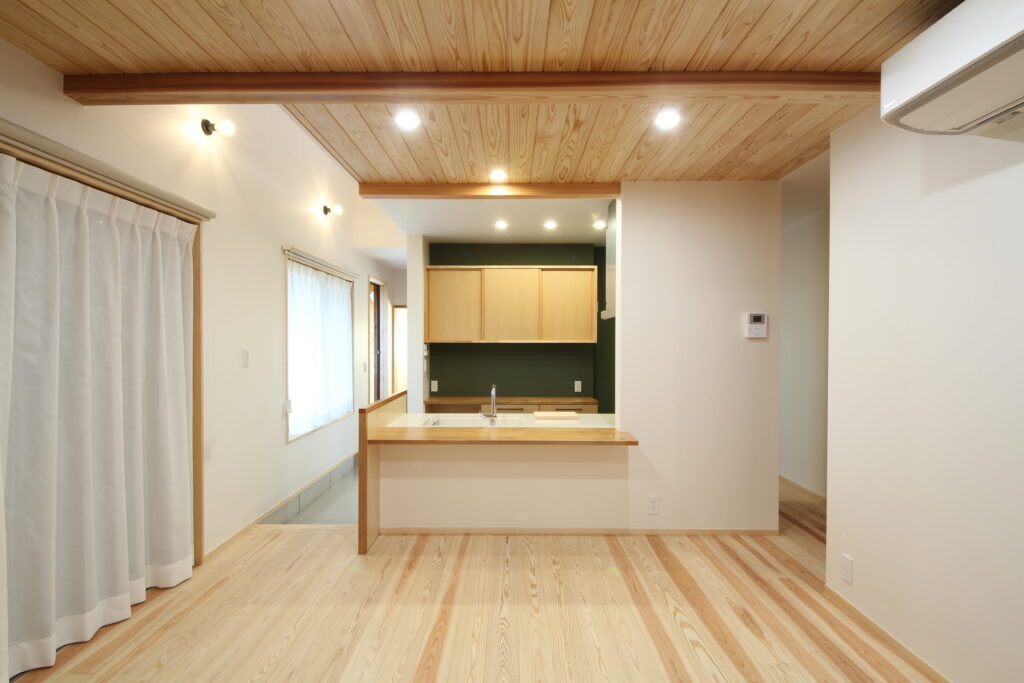 こちらはリビングからキッチンを見た様子。左側のグレーの床部分は玄関から続いている部分です。無垢の床とは1段差があるため、防塵等の役割もあります。