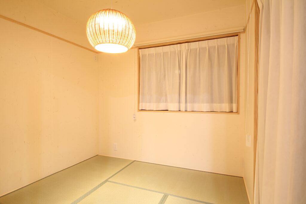 コンパクトな畳のスペースです。写真では伝わらず残念ですが、右の掃き出し窓を開けるとデッキに繋がり開放感があります。また、こちらの壁は土佐和紙仕上げ。包まれたような優しい雰囲気がとても柔らかく印象的でした。