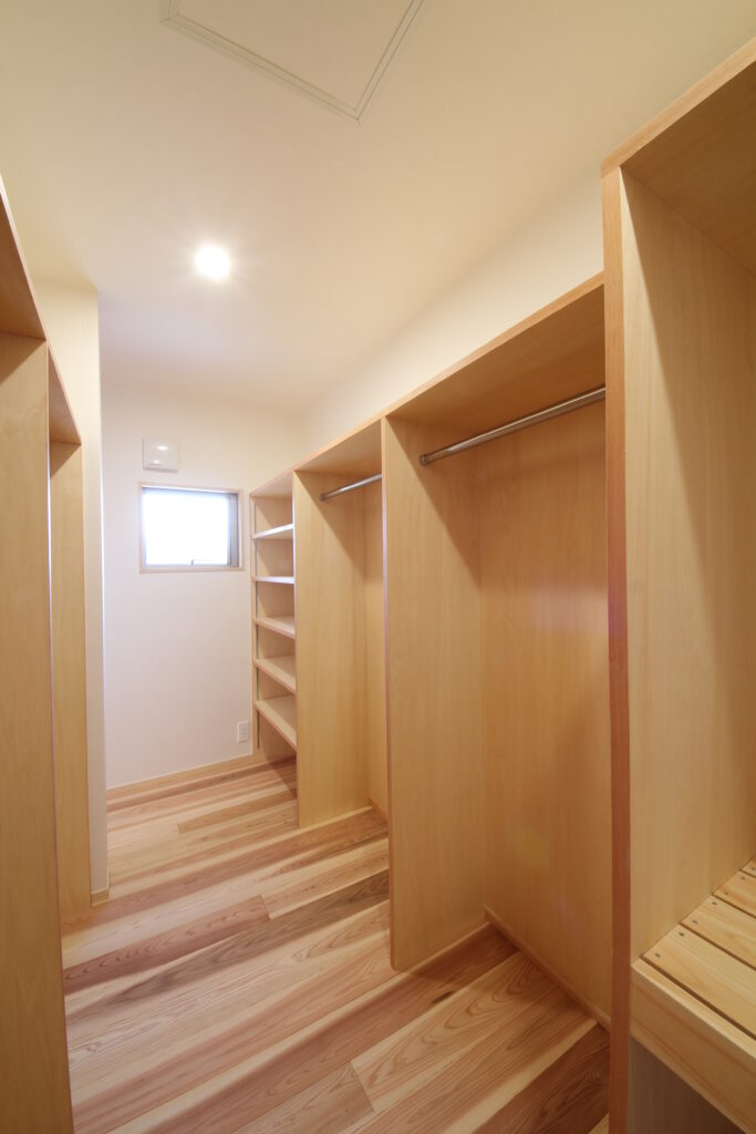 奥の大収納です。普段使いのお洋服はもちろん、季節のお洋服も入れられる大きな収納量です。浴室に近いので動線が良いのも家事楽ポイントですね。