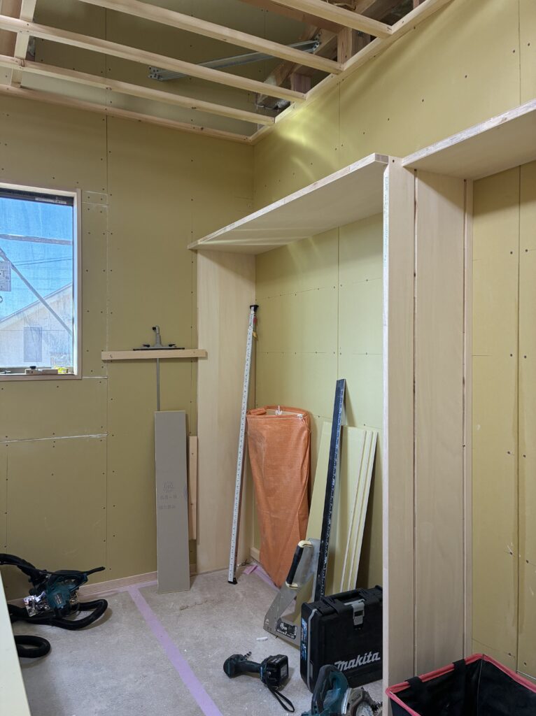 こちらはまだ作業中。玄関から近い位置に大きな収納があります。この棚部分にこれから可動棚の金物を組み込む予定です。