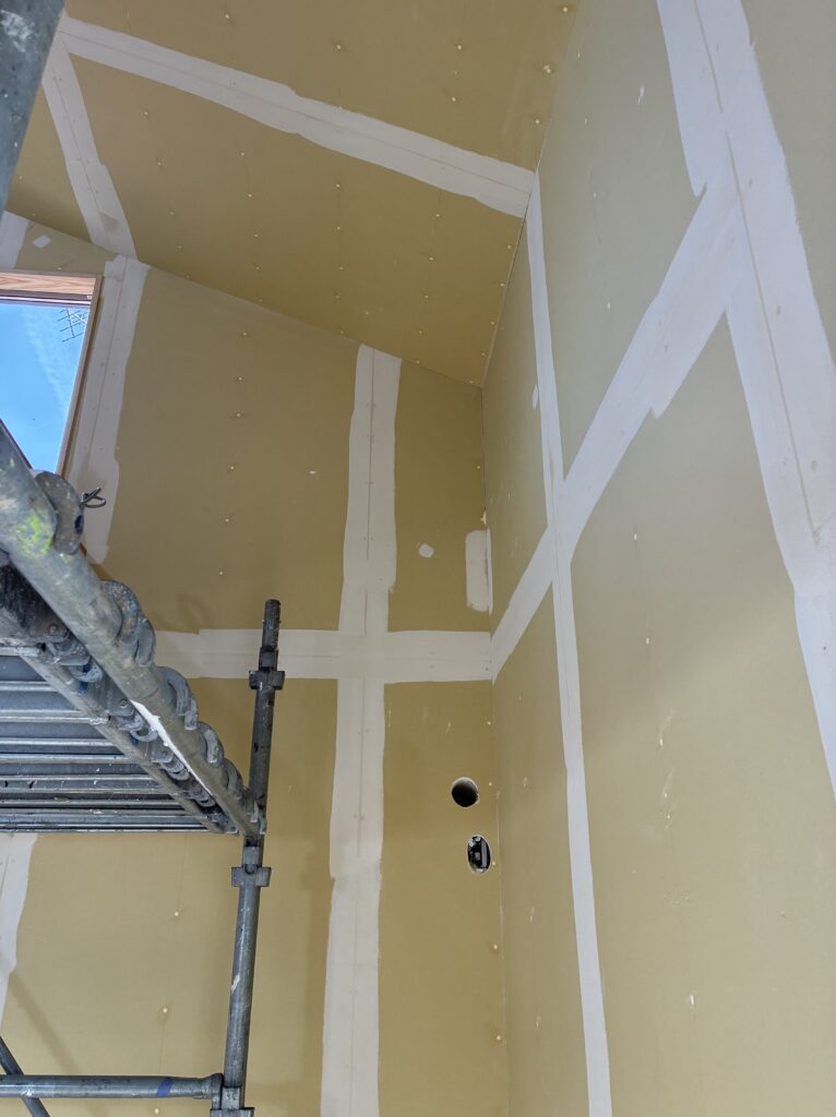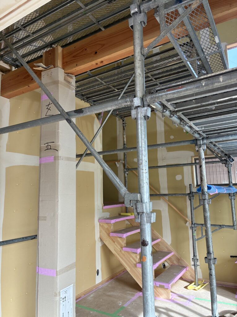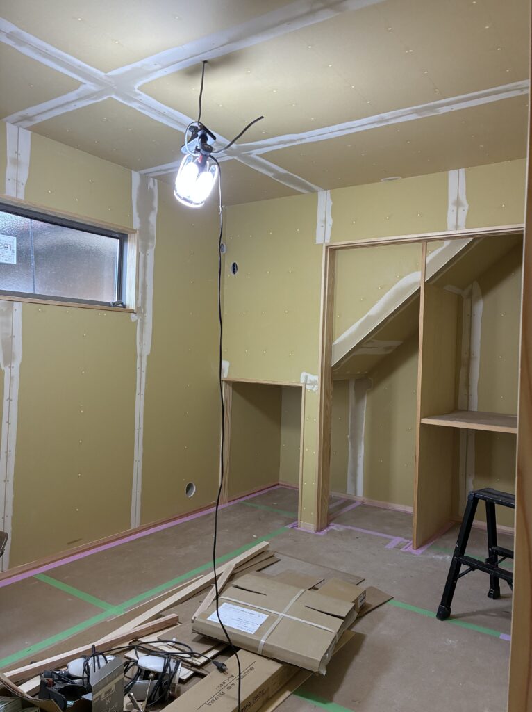 内部はまだまだ絶賛工事中です!大工さんの仕事がほぼ完了し、次は装飾工事へと進んでいきます。今回ご紹介するのはクロス屋さんの内装工事です。