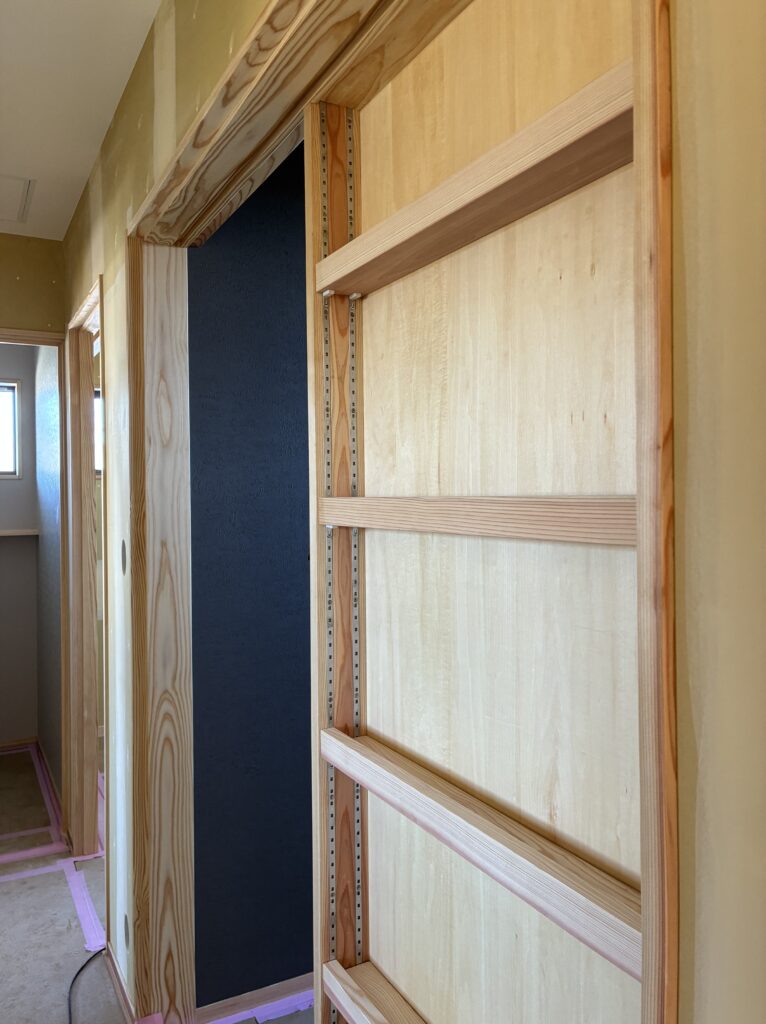 なんだこれ?とお感じになる方も多いと思いますが、こちらは個室に入るための「引き戸」の引き込み壁部分です。(建具が行ったり来たりする場所です)