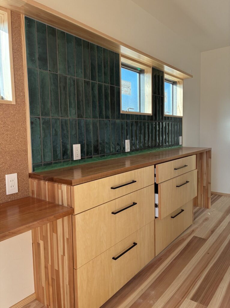 深いグリーンのタイルも素敵です。こちらのカウンターには家電が並ぶ予定。背面のお掃除がしやすいように、タイルで仕上げる工夫も1つのポイントです。忙しい主婦の助かる「家事楽」動線です♪