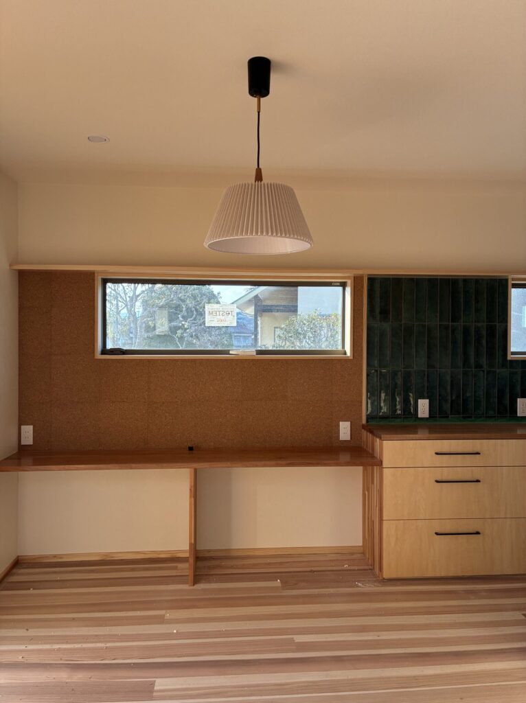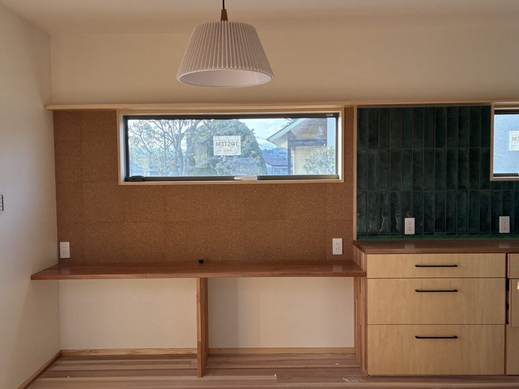 こちらはキッチンと並んだカウンター。(すみません、床養生を外したばかりなので床の掃き掃除を行う前の写真です)横に長いサッシの壁周りは??そうです、「コルク」でできています。