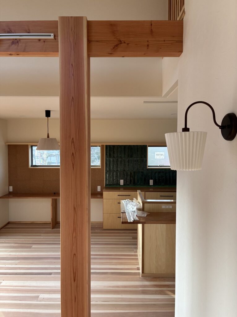 内装工事がぐっと進み、明日はいよいよクリーニングになります。長い時間養生をして保護されていた無垢の床がやっと見えました。美しい杉の床と大きな7寸の大黒柱です。