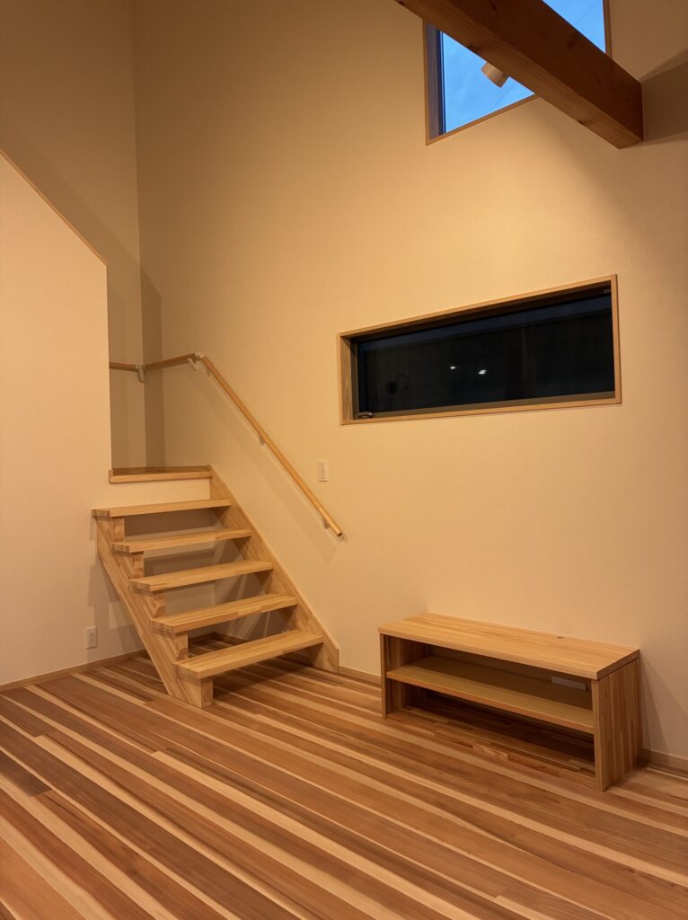 写真はリビングを階段から見た様子。お引っ越し後はソファーやテーブルがここに置かれるかもしれませんね。家族で寛ぐ空間を大切にしてくださるご家族のお住まいです。