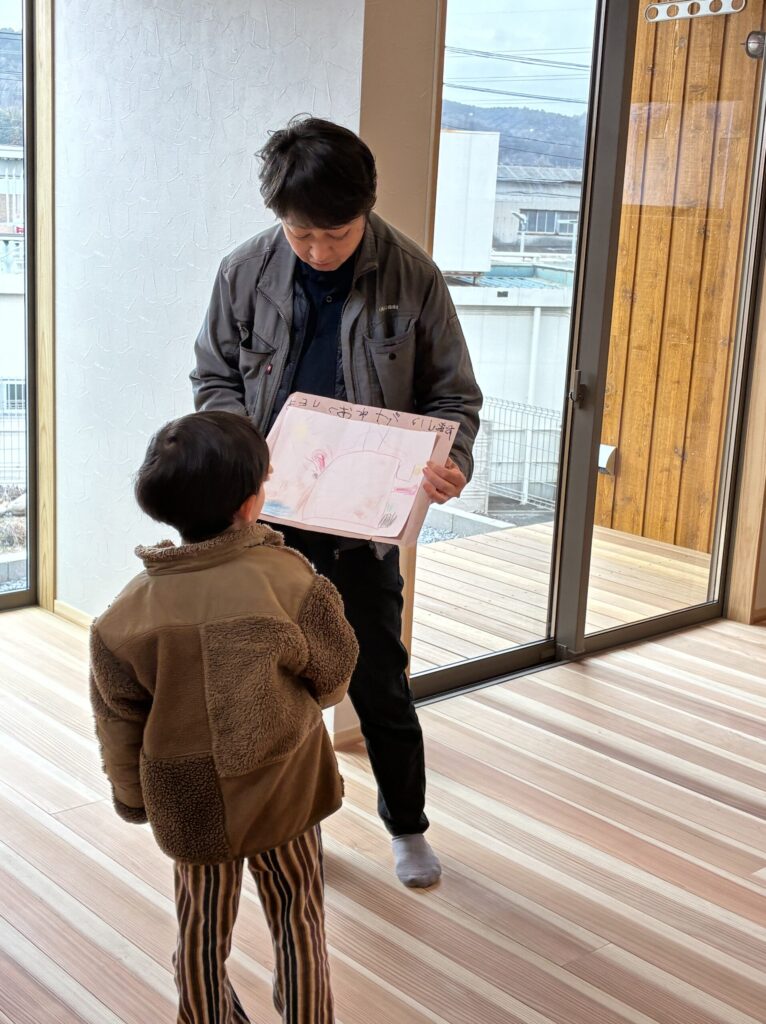 お引き渡しの日、三田はその絵を持ってきていました。そして家づくりの時間分、大きくなった息子さんと一緒に眺めていました。