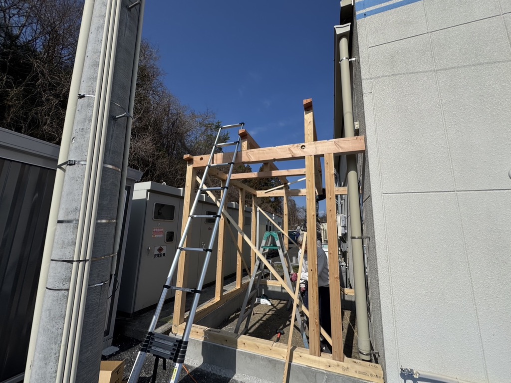 梁を掛けて、屋根の形ができてきました。斜め形状の屋根になるイメージが出来ますね。