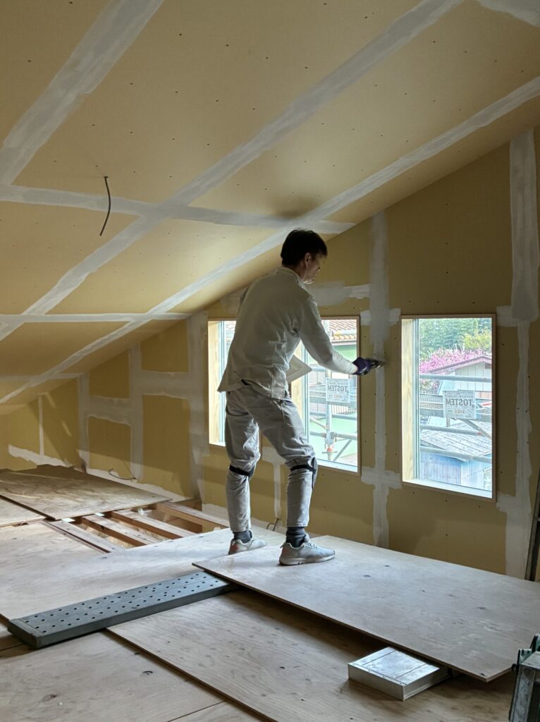 パテをする職人さん。この部分は完成時には「吹き抜け」になります。